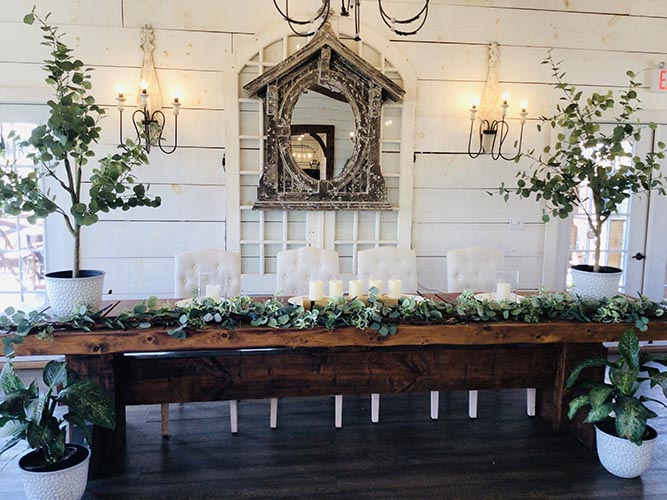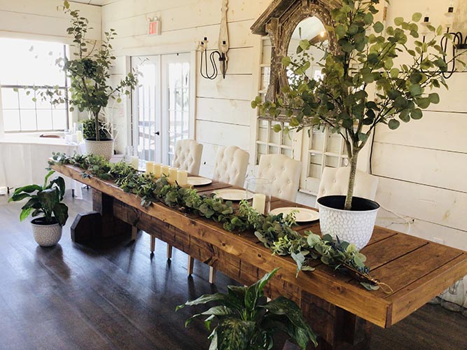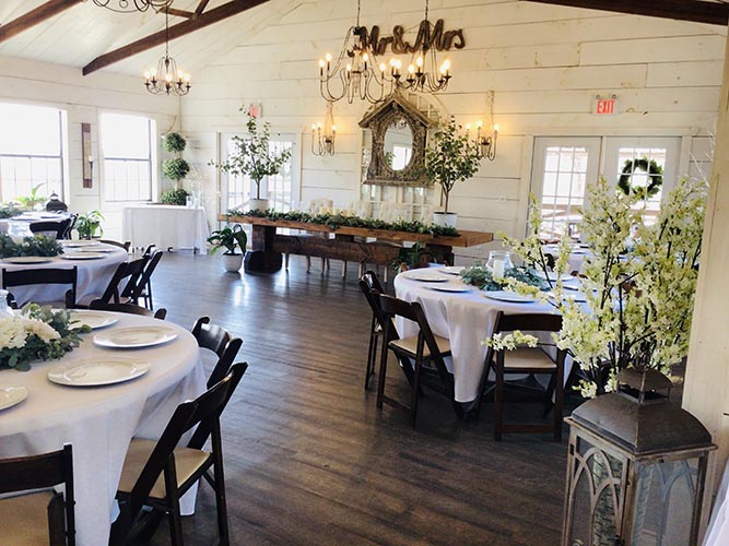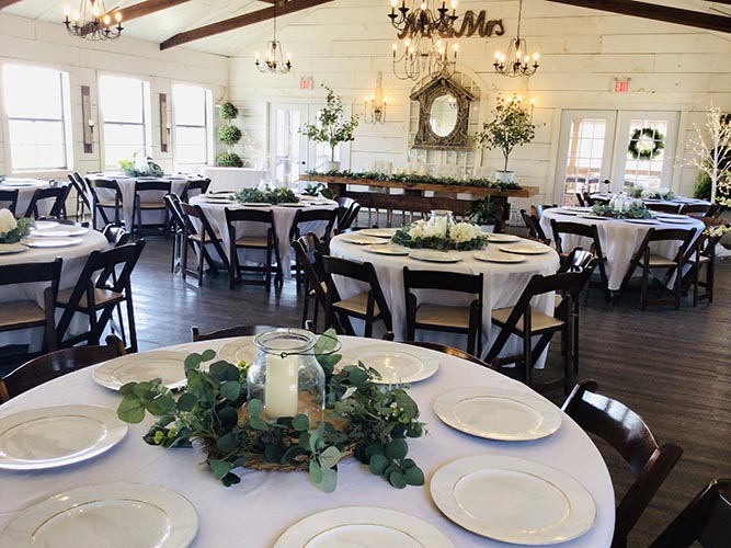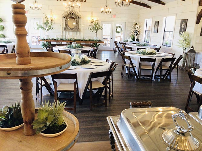 Our Timberline Hall features soaring ceilings with rustic open beams and beautiful deck views of the Ozark Mountains. Shabby Chic styled ship-lap walls and elegant chandelier lighting give this space a vintage, rustic feel. Timberline seats up to 180 guests including deck and bistro seating and has breathtaking views of the Ozarks from it’s large deck space. Central heat and air, spacious dressing room, bar buffet space and kitchen for meal service.